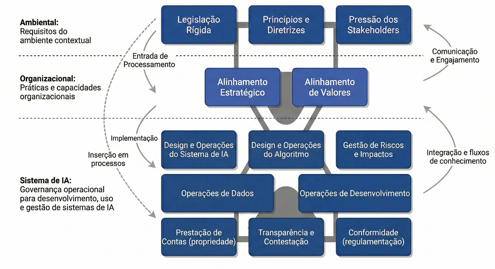 A partir de um sistema integrado alinhado aos objetivos estratégicos e valores da organização, as decisões sobre quais casos de uso priorizar, quais dados coletar, que modelos treinar, como explicar resultados, quem envolver e como monitorar os impactos passam a ser deliberadamente incoporadas ao longo de toda a cadeia de desenvolvimento tecnológico e prestação de contas.